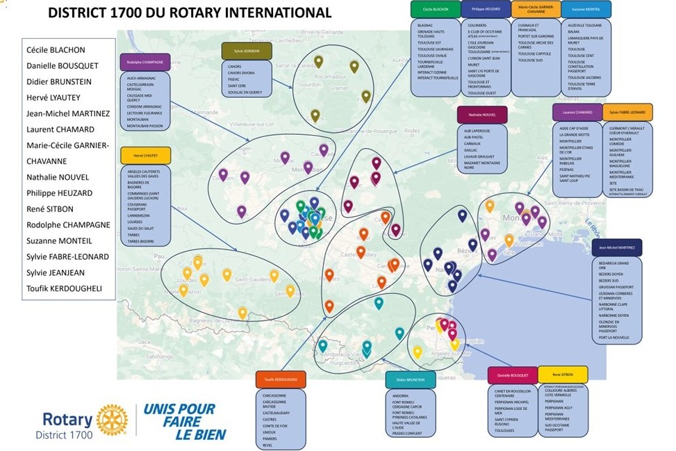 Le District 1700 couvre une grande partie de la région Occitanie et Andorre et compte 101 clubs et 2500 rotariens répartis sur les départements suivants : L'Hérault, L'Aude, Les Pyrénées Orientales, L'Ariège, Le Tarn, La Haute-Garonne, Le Tarn-et-Garonne, Les Hautes Pyrénées, Le Gers, Le Lot et la Principauté d’Andorre.